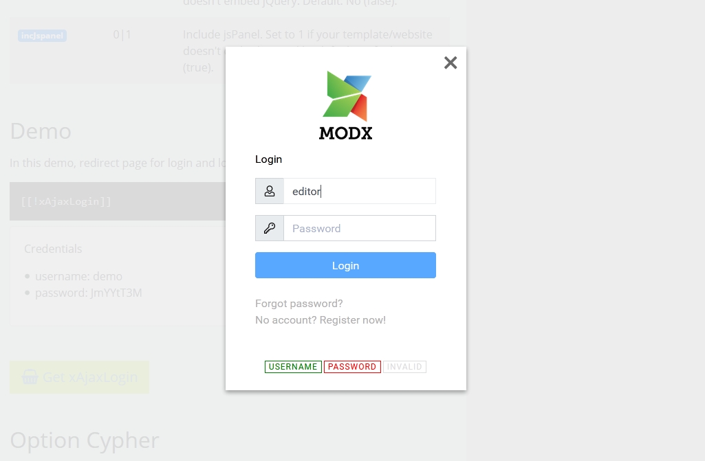 xAjaxLogin allow AJAX front-end login and prevent bots to submit login forms. When the 'Login' button is clicked a modal window with a login form appears on screen. The login form doesn't exists in code on page load. The form results from a response from the server and is integrated in the modal window.
