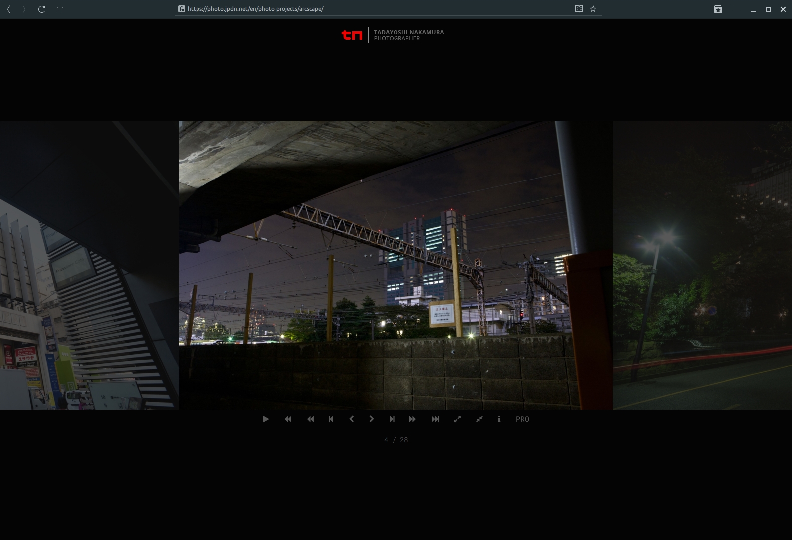 Site internet du projet photographique Arc*scape (architecture et urbanisme à Tokyo). Les images sont présentées sous la forme d'une bande (filmstrip) que l'on peut faire défiler comme un diaporama. Le format et le jeu sur l'opacité donnent une vision de style "panoramique" tout en continuité. Les images sont redimensionnées de manière dynamique en fonction de la résolution d'écran, accentuées en fonction de leur dimensions, puis pré-chargées afin d'assurer des transitions fluides et le meilleur rendu possible.
